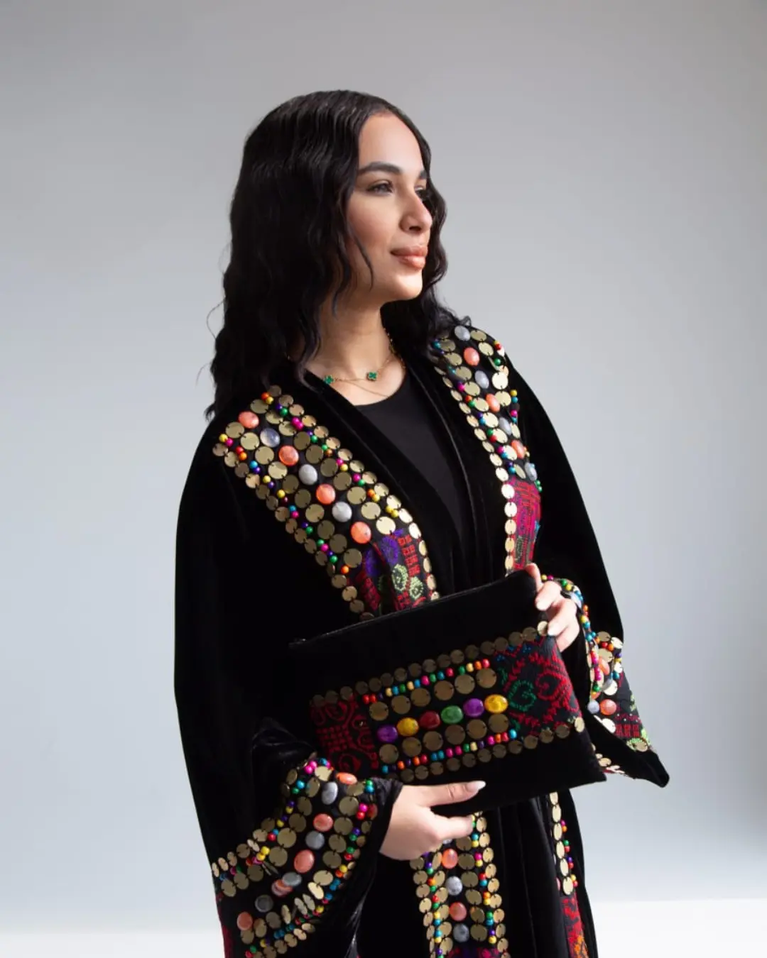 تألقي بإطلالة ملوكية مع هذا القفطان الأسود الفاخر، المصمم بتفاصيل تراثية أنيقة وتطريز يدوي مستوحى من الفن التقليدي. مزين بلمسات ذهبية تضيف لمسة راقية وساحرة، مما يجعله الخيار الأمثل للمناسبات الفاخرة والسهرات الخاصة.Indulge in a royal look with this luxurious black kaftan, featuring exquisite traditional embroidery and elegant golden accents. Designed for a sophisticated and glamorous appearance, perfect for special occasions and elegant evening gatherings.