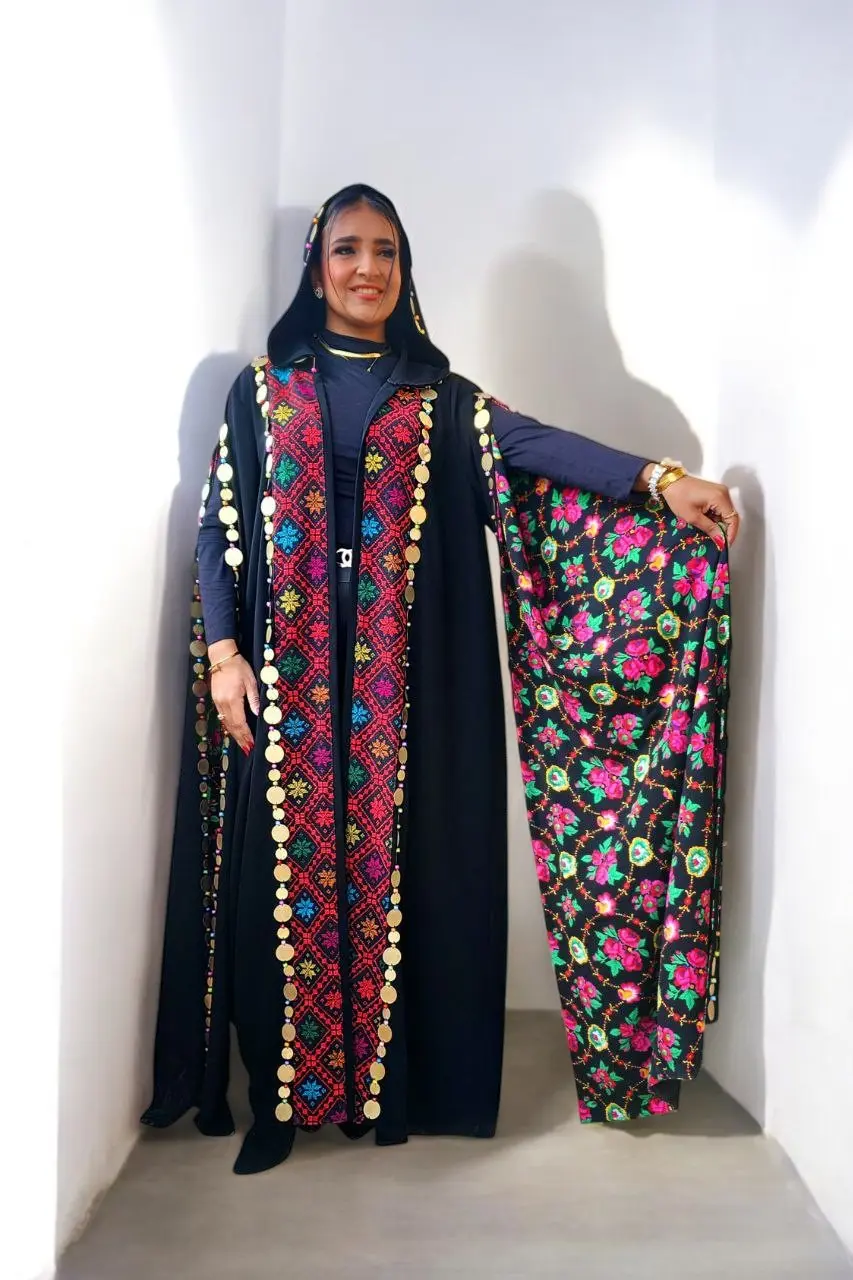 photo 5832642047432049961 y photoroom 1.webpقُفطان كريب إكسترا فلوري هندي بتطريز سيناوي يدوي وعملات معدنية وكريستال | Extra Crêpe Floral Indian Kaftan with Handmade Sinai Embroidery, Coins & Crystals