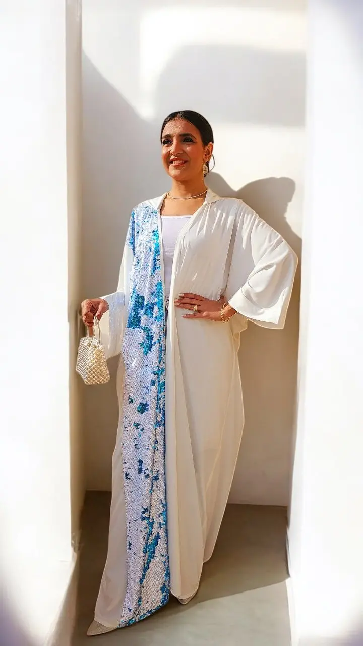 تألقي بفخامة مع قُفطان كريب رويال فري سايز المصمم بتفاصيل بايت قلاب تمنحك لمسة ساحرة. مناسب لجميع المقاسات لإطلالة أنيقة ومريحة. احصلي على حقيبة اللؤلؤ الفاخرة بالطلب لتكملي إطلالتك بأسلوب راقٍ.Elevate your style with the Crêpe Royal Kaftan Free Size, featuring elegant flip sequins for a magical touch. Suitable for all sizes, offering both elegance and comfort. Complete your look with the luxurious pearl bag, available upon request.